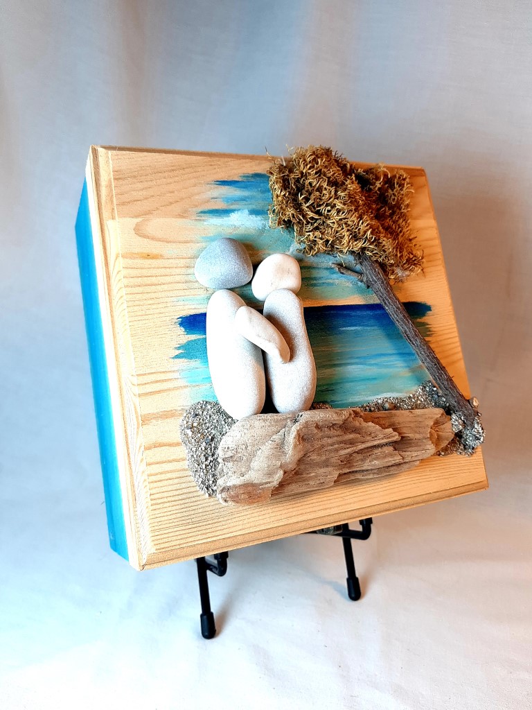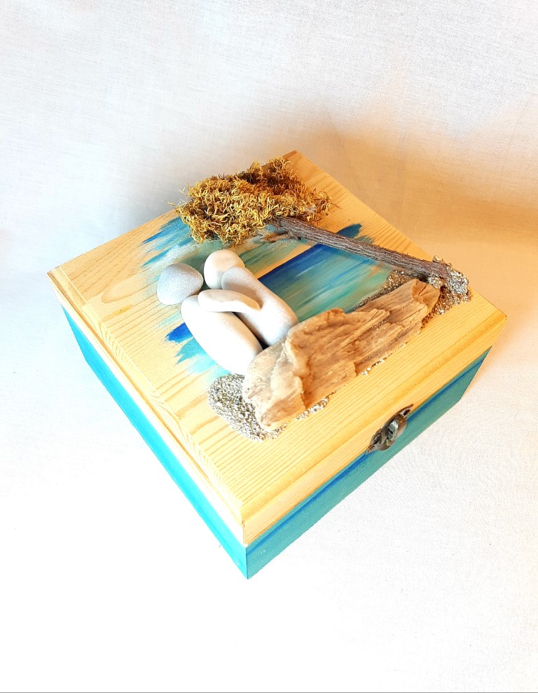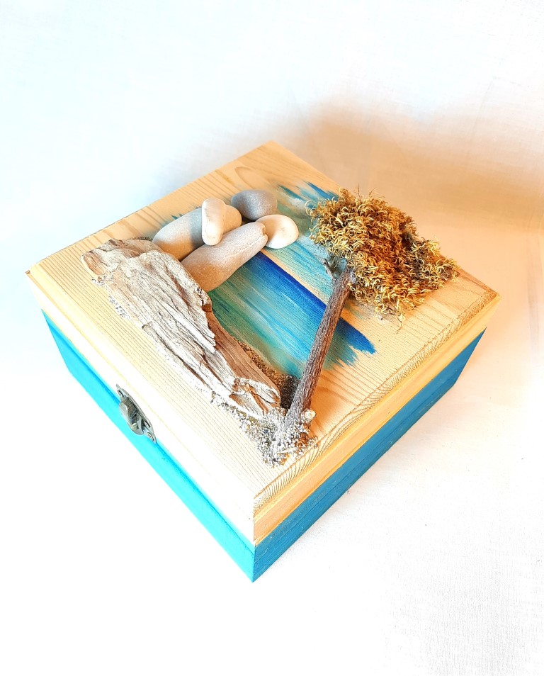 Painted wooden box with pebbles and natural materials.